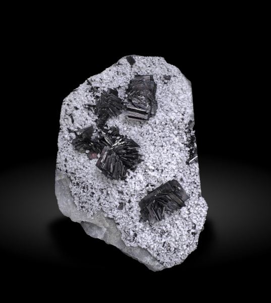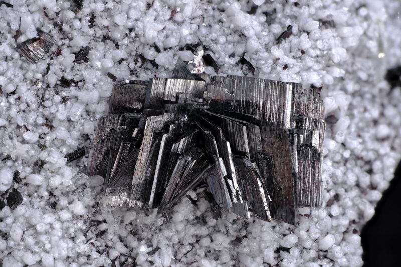 Groups of very sharp Hübnerite crystals, with a short prism that gives them an appearance between tabular and lamellar. Very lustrous, with vivid reddish internal reflections, implanted in a matrix covered by white microcrystals of Quartz. The matrix was sawn on the back.The specimen has been analyzed and we will send a copy of the analysis to the buyer.