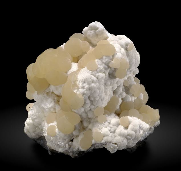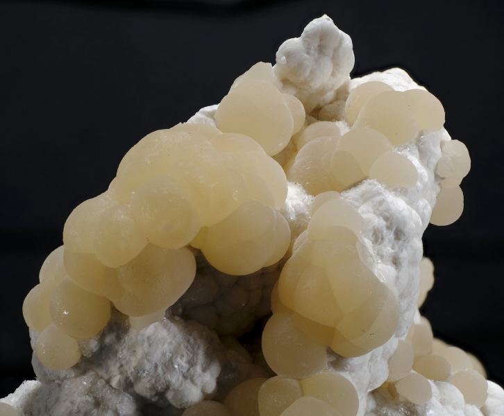 Spheroidal growths of Bultfonteinite, of good size, on matrix, with Tobermorite-Clinotobermorite that forms small fibrous spheroidal coatings of white color associated with Andradite on the matrix. The specific area in the locality where the discovery took place has now been covered over, so no new finds are expected at that specific location.