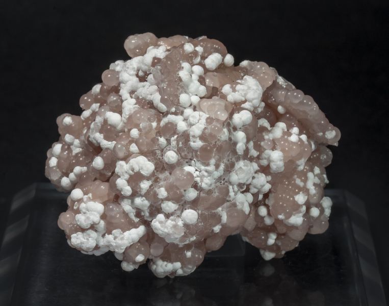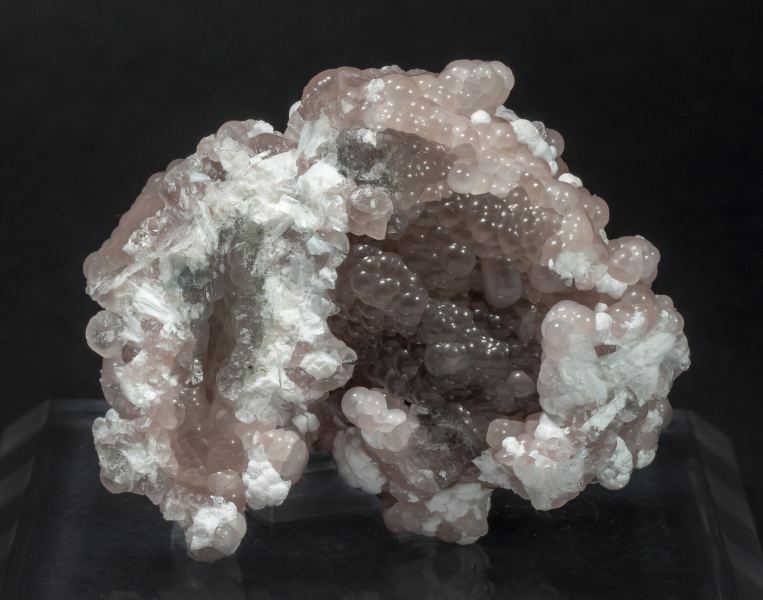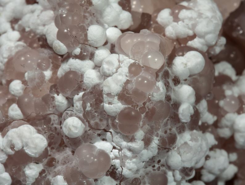 New for summer 2021: Tobermorite forms small, snow-white fibrous spheroidal coatings on translucent orange-pink spheroidal growths of Datolite (bakerite variety).These specimens have been analyzed and we will send a copy of the analysis to the buyer. To learn more about this species and the rest of the paragenesis discovered so far in this mine, it is essential to read the article 'Rare Borate Minerals from the Shijiangshan-Shalonggou Deposits, Hexigten Banner, Inner Mongolia, China' whose authors are César Menor-Salván, Berthold Ottens and Ed Richard, featured in Rock & Minerals magazine, September-October 2021, Volume 96, Number 5.