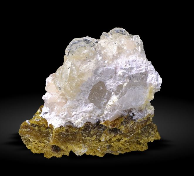 New for 2021 and, in all probability, the best known so far for the species. Imayoshiite occurs as numerous very sharp crystals, with a tabular shape and hexagonal outline, transparent, very lustrous and colorless to slightly yellow, which occur together with spheroidal growths of pink-orange Bultfonteinite, with small white fibrous coatings of a Tobermorite-Clinotobermorite, on Andradite matrix. The specimen has been analyzed and we will send a copy of the analysis to the buyer. If you want to go deeper into the species and the paragenesis of this mine, you can consult the article by Menor-Salván, C.; Ottens, B.; Richard, E. Rare borate minerals from the Shijiangshan-Shalonggou Deposits, Hexigten Banner, Inner Mongolia, China. Rocks & Minerals, 96(5) (September/October 2021).