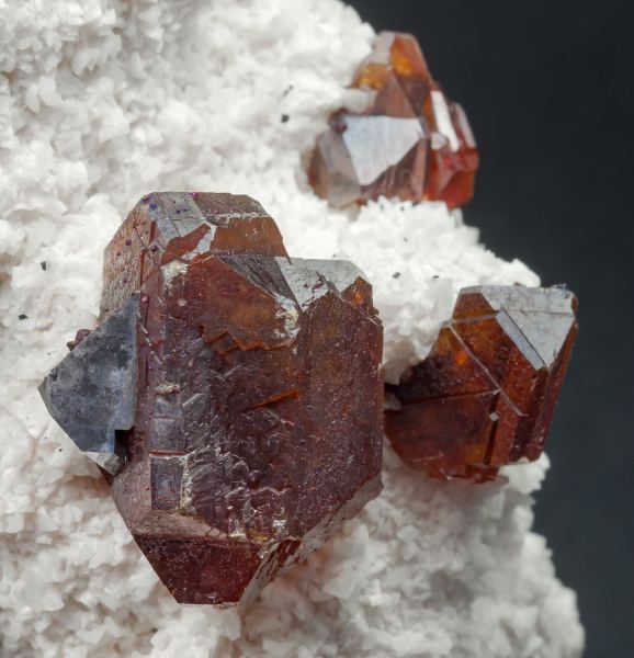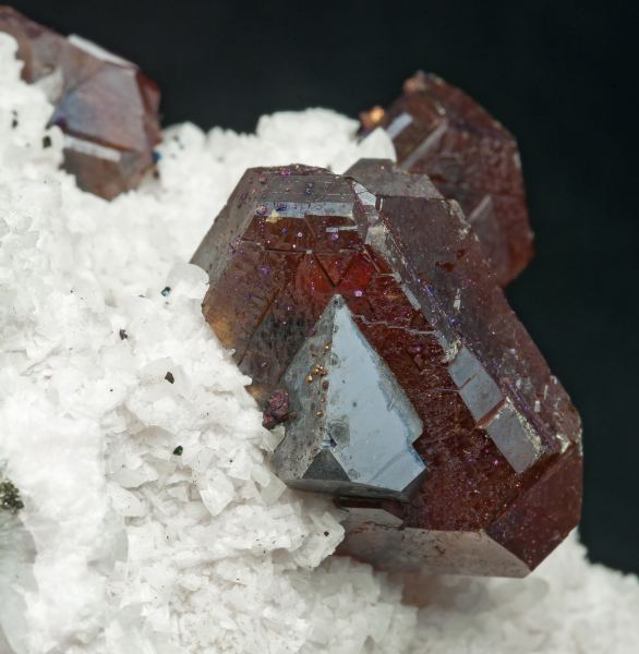 New at Ste. Marie 2022Twinned Sphalerite crystals, more isolated than usual, sharp and with very well defined faces and edges, between translucent and transparent, lustrous and very intense reddish, on matrix, with small white Calcite crystals.