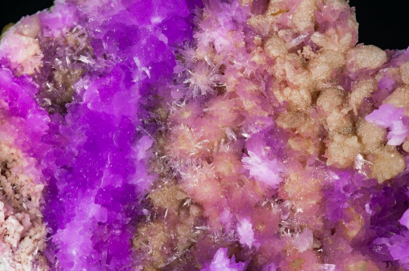 A novelty from China. Calcite crystals coated by Talmessite with pinkish tones, more or less reddish depending on the area of the specimen. On matrix, with coralloidal growths of Calcite (cobalt-bearing variety) of a very intense mauve color.The specimen has been analyzed and we will send a copy of the analysis to the buyer.