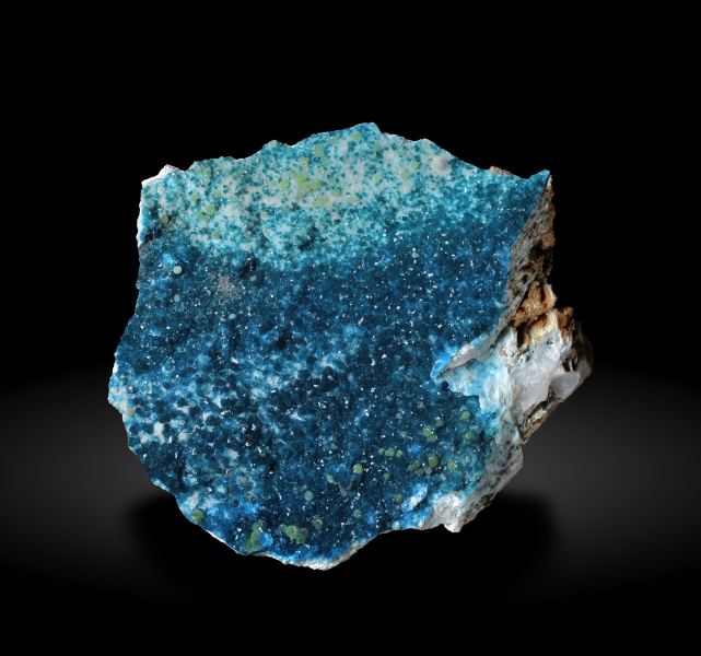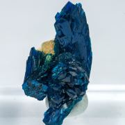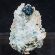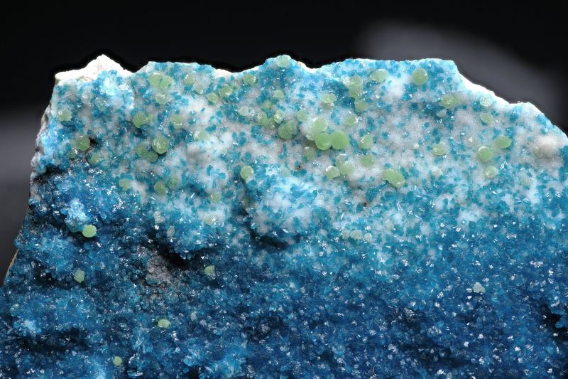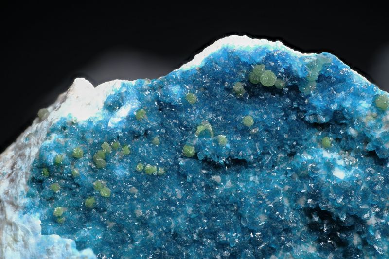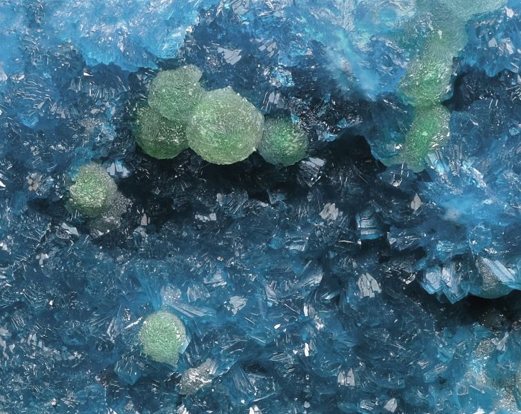 Translucent and lustrous spheroidal aggregates with a pale bluish green color of Cuprodongchuanite, a rare phosphate of lead, copper and zinc, discovered very recently and approved by the IMA as a new species in 2021. On matrix, accompanied by numerous Veszelyite crystals, very sharp and deep blue. The specimen is from the type locality for the species.