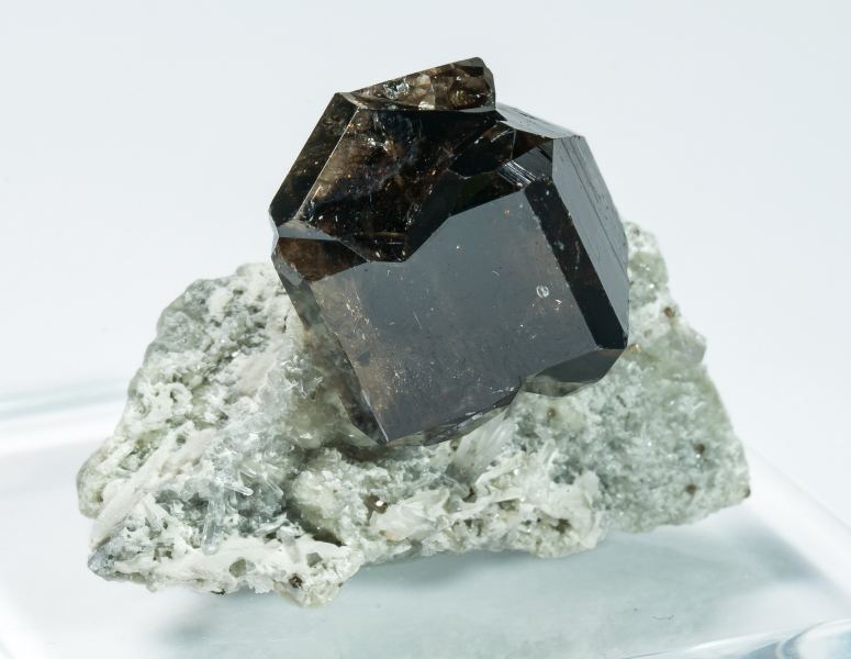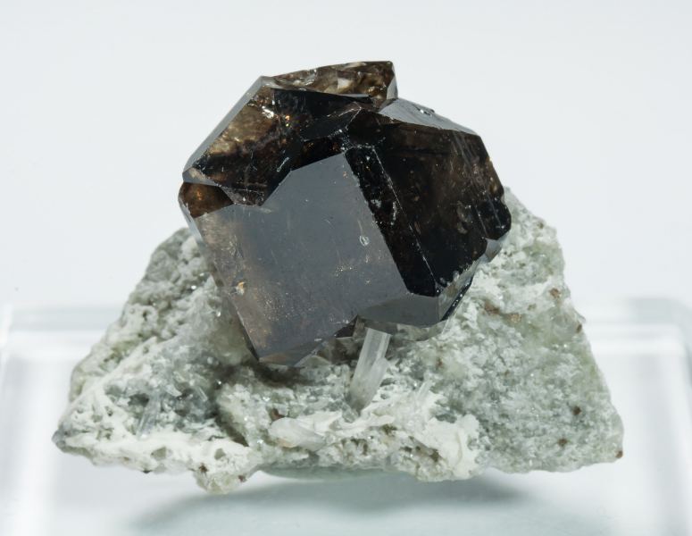 Twinned Cassiterite crystal, very aerial on matrix, with very sharp crystal forms, between transparent and translucent, with very bright luster and with color zoning, denser in the center of the crystal.Amo deposit, Ximeng, Pu'er Prefecture, Yunnan Province China