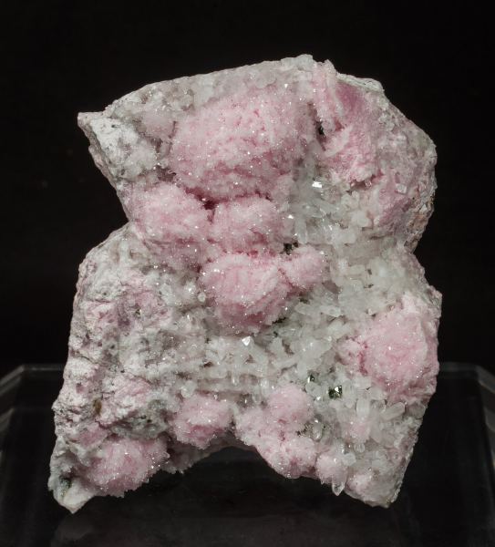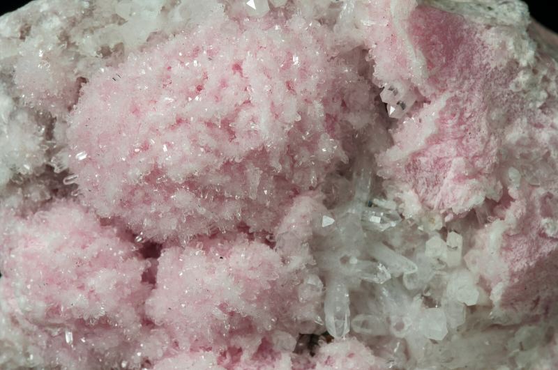Spheroidal growths of small lenticular crystals of Rhodochrosite with an intense and uniform pink color, with very lustrous Quartz crystals and aggregates of microcrystals of Sphalerite.Austria Duvas Mine, Morococha District, Yauli Province, Junín Department Peru (07/2021)