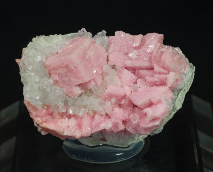 Very sharp rhombohedral crystals of Rhodochrosite, isolated and in groups, with good luster and an intense, vivid and uniform pink color. On matrix with small Quartz crystals.Manuelita Mine, ↓1400 m., Morococha District, Yauli Province, Junín Department Peru (03/2019)