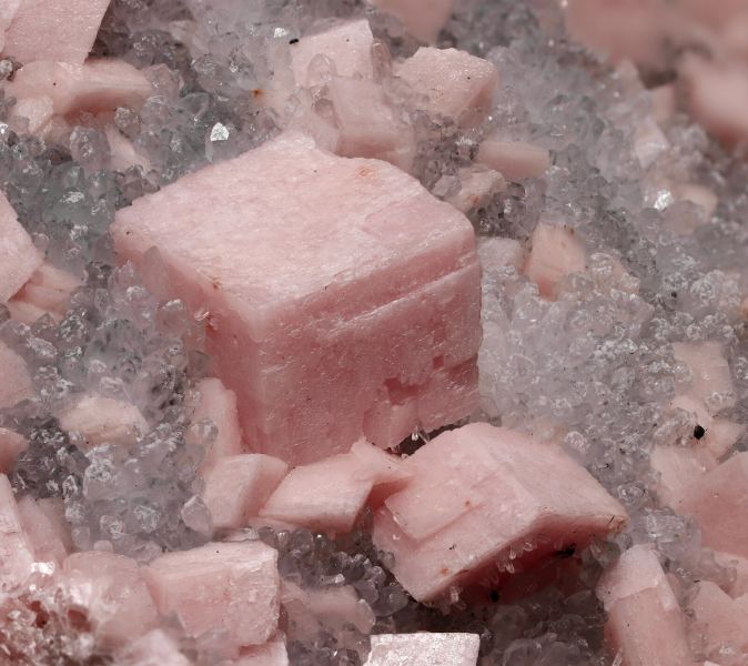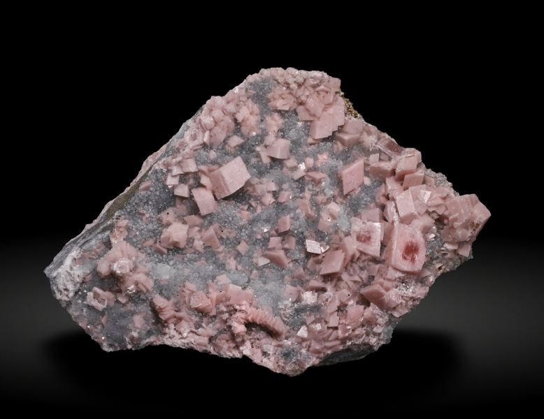 Rhombohedral crystals of Rhodochrosite, more isolated and much sharper than usual in specimens from this locality. They are lustrous, with an intense pink color, on matrix, with small Quartz crystals.Manuelita Mine, ↓1400 m., Morococha District, Yauli Province, Junín Department Peru (03/2019)