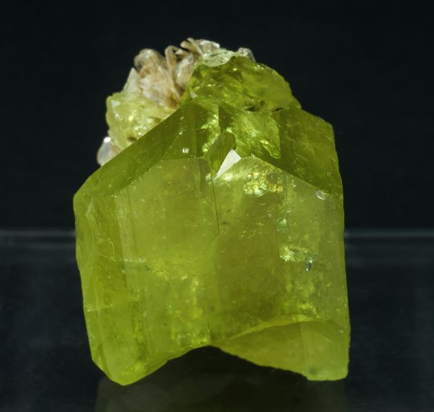 Thick prismatic crystal of Brazilianite, transparent, with good luster and an intense color, on matrix with leafy aggregates of lamellar Muscovite crystals.João Lopes Claim, Linópolis, Divino das Laranjeiras, Vale do Rio Doce, Minas Gerais Brazil