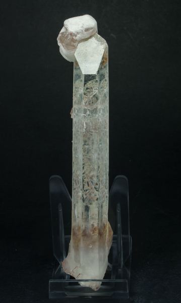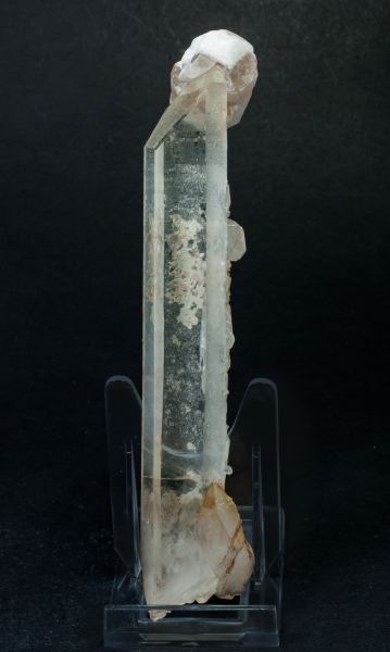 Very elongated individual Quartz crystal, with the characteristic Dauphine habit. Transparent, lustrous, with inclusions and very aerial and complex Calcite crystals with selective color zoning, implanted between the prism and the terminations of the Quartz.The specimen comes from the Santiago Jiménez collection, basically dedicated to Spanish localities but with good specimens from other countries too.Diamantina, Jequitinhonha, Minas Gerais Brazil