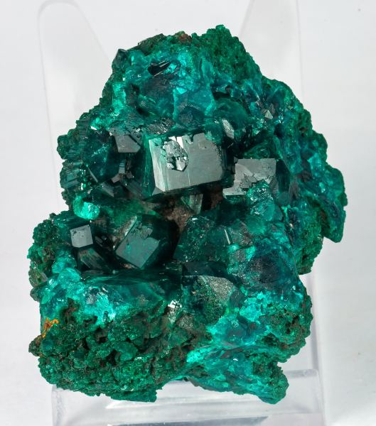 Group of profiled Dioptase crystals, with the dominant forms of the short prism and flattened terminal rhombohedron, on matrix, translucent, with good luster and an intense and uniform green color, of considerable dimensions for the species.Mindouli, Mindouli District, Pool Department Republic of the Congo