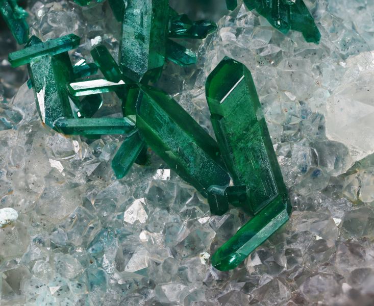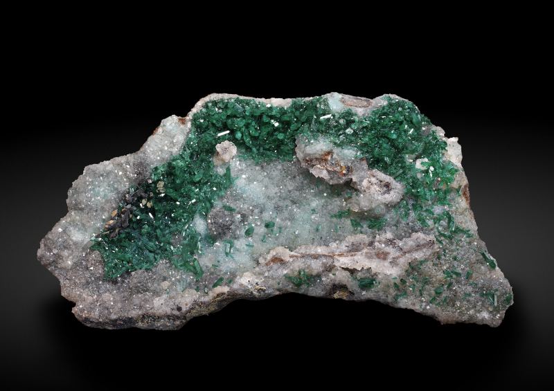 Dioptase crystals, isolated or in small groups, more elongated than usual in the species and many of them doubly terminated, extraordinarily lustrous and on matrix. On Quartz and associated with Plancheite. The specimen comes from a very little known locality.The Plancheite has been analyzed and we will send a copy of the analysis to the buyer.