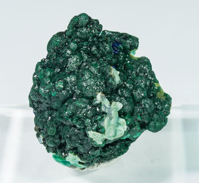 Brilliant botryoidal Malachite aggregates of deep green tones, with remnants of the enclosing concretion that is distinguished by lighter greenish tones, with Azurite aggregates, especially visible on the back face.The specimen, which is from a known African locality but one from which quality specimens are rare, comes from the old collection of Robert-Auguste Touchon and is accompanied by a handwritten label, which will be delivered to the buyer of the piece.