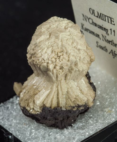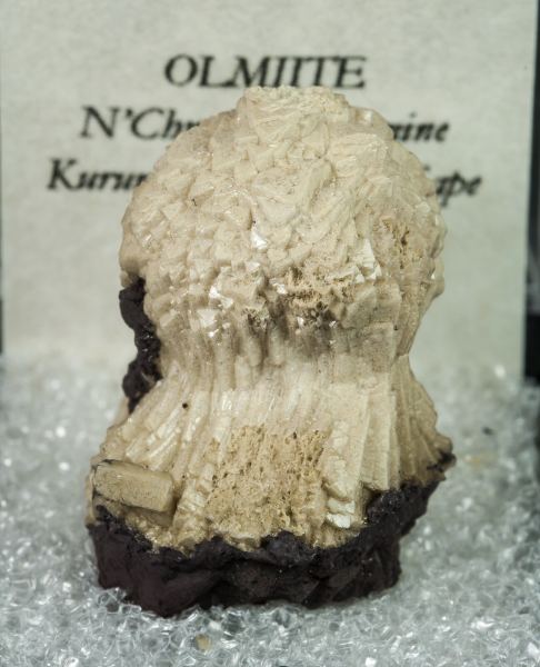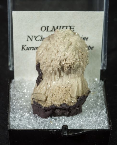 Sheaf-like growth of Olmiite crystals with well defined faces and edges, with good luster and a pale brown color, on matrix.We will ship the specimen in its original Perky box from the Robert J. Noble collection, which also contains the label.