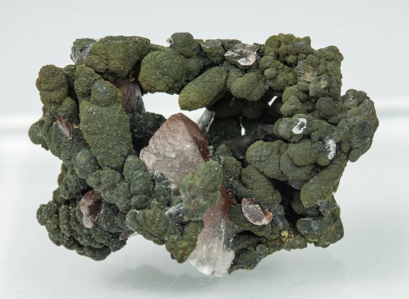 Group of Mottramite crystals with a dark green color and velvety appearance showing cavities which Calcite crystals have taken advantage of to develop, one of them very visible, forming defined faces and edges, with a soft pink color.The specimen comes from the collection of duplicates of Carles Curto No. 1982.33, whose digital catalogue entry we will send to the buyer.