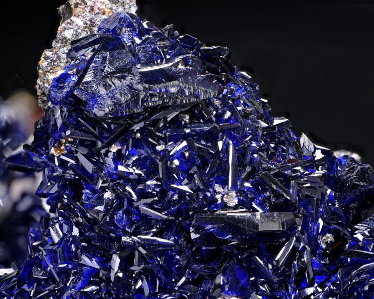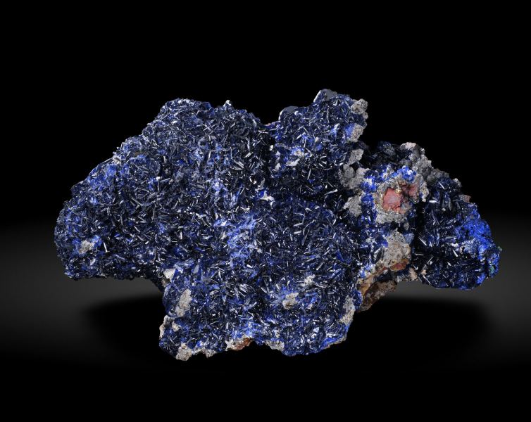 Druse of very sharp and lustrous Azurite crystals with an acute prismatic shape, translucent, and on matrix.A good Tsumeb classic.
