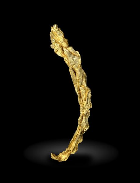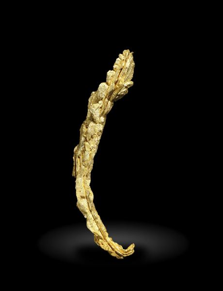 Very stylized parallel growth of octahedral Gold crystals, with a very sharp crystal morphology, a very distinct spinel-law twin and a hooked termination. This material has been carefully analyzed and we will send a copy of the analysis to the buyer.