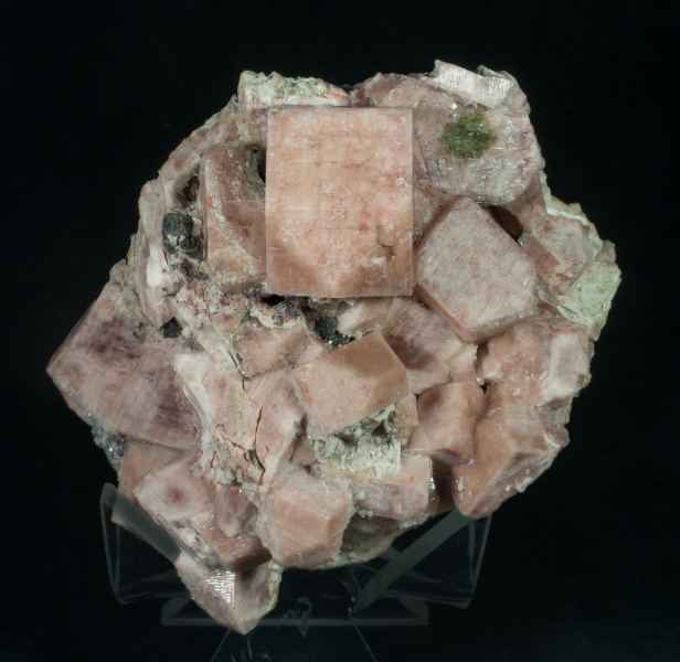 Obtained at Munich 2022Group of Microcline crystals, one of them clearly dominant, with very well defined Baveno-law twins, with good luster and an intense pink color, accompanied by Quartz crystals that are clearly pseudomorphing some other pre-existing species, possibly Vesuvianite. The Quartz pseudomorphs have been analyzed and we will send a copy of the analysis to the buyer. The specimen comes from finds made in the Imilchil area between August and September of 2022