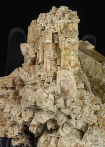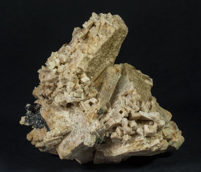 Group of elongated Microcline crystals, with very sharp crystal forms, some of them with curious geometric dissolution channels in the heart of the crystal and with coatings of small crystals of very shiny Magnetite.Imilchil area, Anti-Atlas, Er Rachidia Province, Drâa-Tafilalet Region Morocco (05/2022)