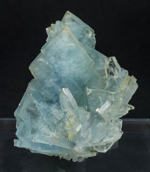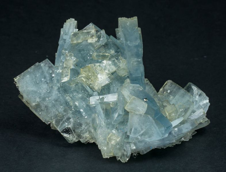 Obtained at Munich 2022Group of tabular and very sharp Baryte crystals between transparent and translucent, lustrous, and intense blue with yellowish tones in some vertices. The specimen comes from finds made in the Bou Nahas mine between August and September of 2022.