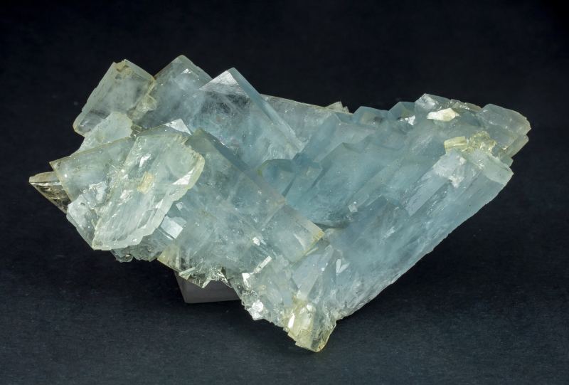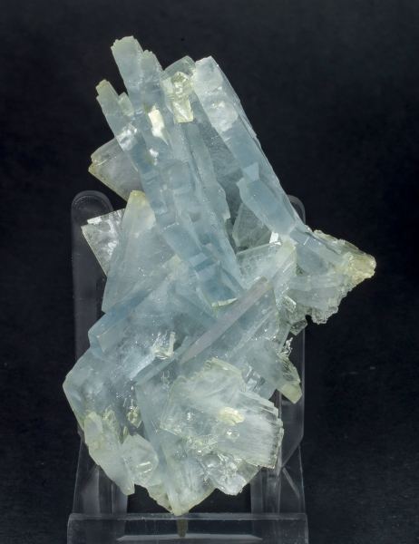 Obtained at Munich 2022Group of tabular and very sharp Baryte crystals between transparent and translucent, lustrous, and intense blue with yellowish tones in some vertices. The specimen comes from finds made in the Bou Nahas mine between August and September of 2022.