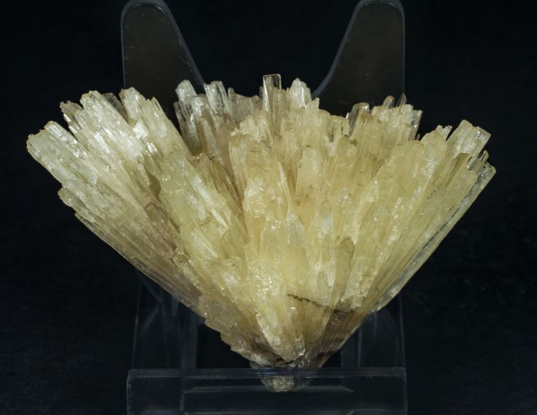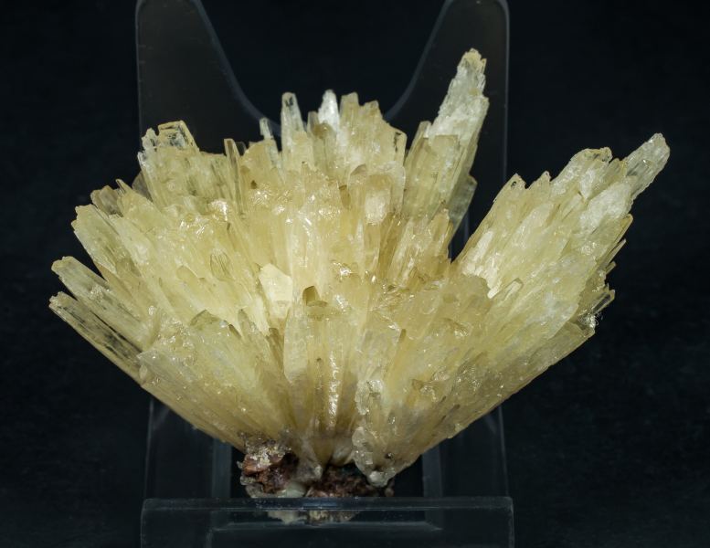Centered group of very elongated Aragonite crystals, with good terminations, translucent, with a satiny luster and a uniform yellowish color.The specimen has been analyzed, resulting in Aragonite with slight traces of iron, and we will send a copy of the analysis to the buyer.