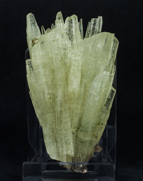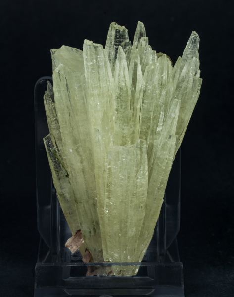 Centered group of very elongated Aragonite crystals, with good terminations, translucent, with a satiny luster and a uniform greenish color. With Quartz and small green inclusions at the base.The specimen has been analyzed, resulting in Aragonite with slight traces of iron, and we will send a copy of the analysis to the buyer.
