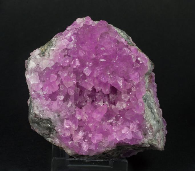 Obtained at Ste. Marie 2022Druse with scalenohedral Calcite crystals with very well defined crystal forms, transparent and very lustrous. On matrix and with excellent color, between pink and mauve (cobalt-bearing variety). Very characteristic of the finds made at this mine in the beginning of the 21st century.