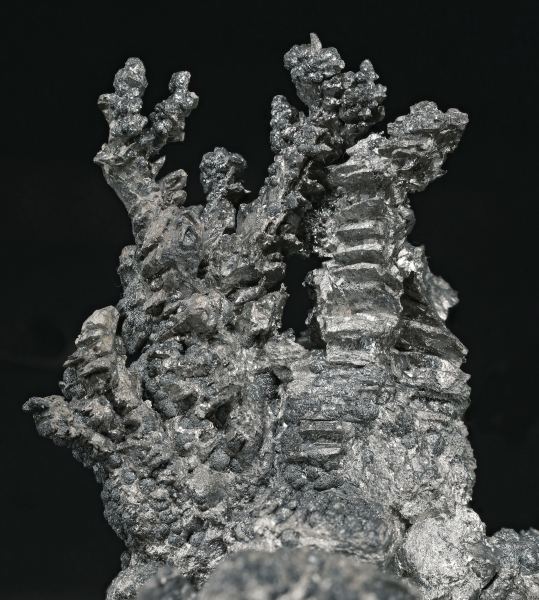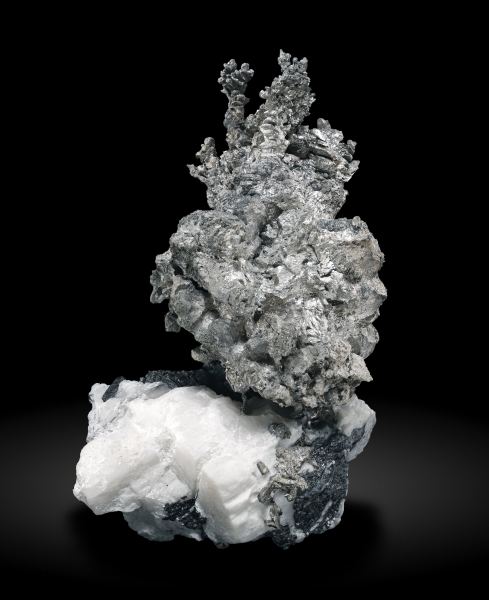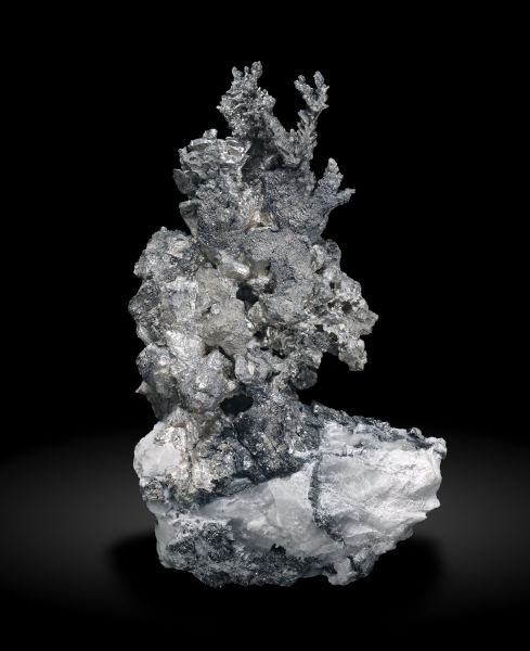 Arborescent growth of Allargentum pseudomorphs after Dyscrasite crystals with easily visible Dyscrasite crystal forms. It sits on a Calcite matrix, with Sphalerite and small black crystals of Pyrargyrite and Schachnerite.This specimen has been analyzed and we will send a copy of the analysis to the buyer.