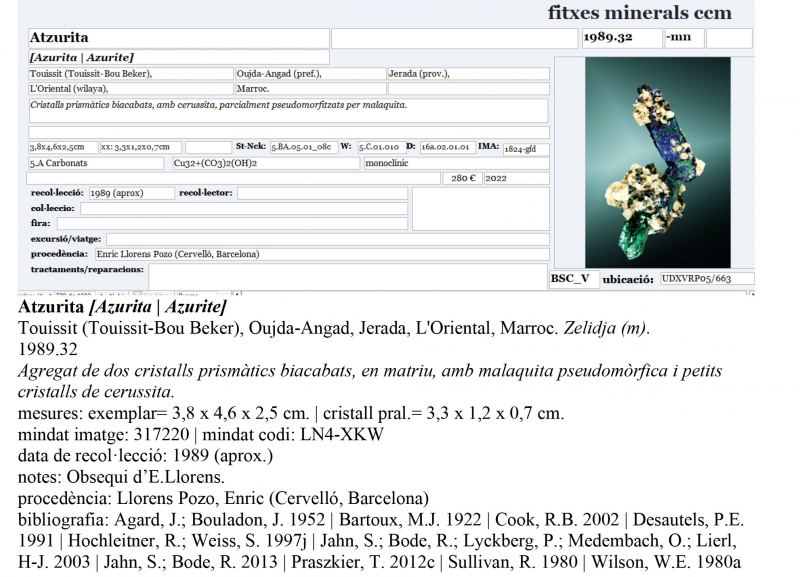 Pair of doubly terminated crystals of Azurite, one of them totally pseudomorphed by Malachite, arranged in a very aerial way with faces and sharp edges, and partially covered by Cerussite crystals and small traces of matrix.The specimen, a Moroccan classic from the most splendid years of Touissit, comes from the collection of duplicates of Carles Curto (number 1989.32), whose digital file we will send to the buyer.