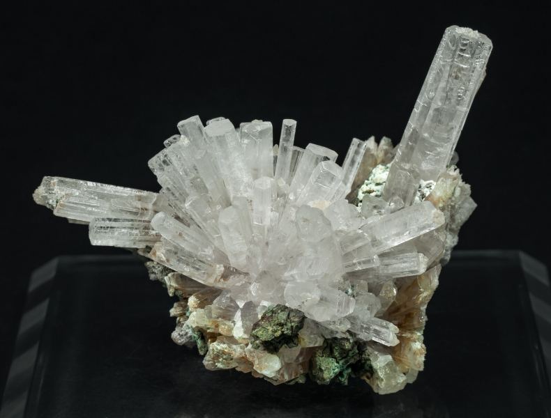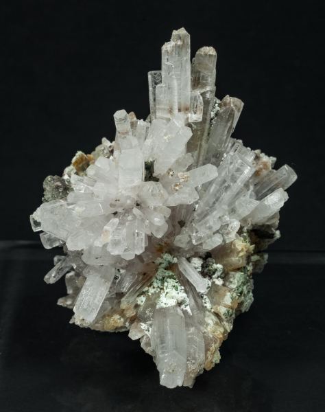 Elongated Aragonite crystals, most of them transparent and lustrous, radially arranged around a little rock matrix. Almost entirely colorless, but some of the crystals have a small yellowish coating on the terminations of the crystals.Mamsa, Sidi Ayad (Sidi Ayed), Boulemane Province, Fès-Meknès Region Morocco (04/2022)