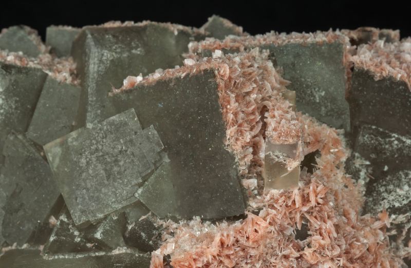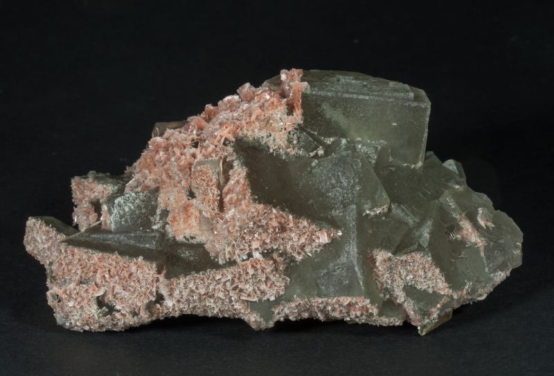 Group of very sharp Fluorite crystals, translucent, with good luster and a yellow-green color, with partial coatings of microcrystals of Quartz and small lamellar crystals of pink Baryte. Different from those previously found in this deposit.Sidi Ayad (Sidi Ayed), Boulemane Province, Fès-Meknès Region Morocco (09/2021)