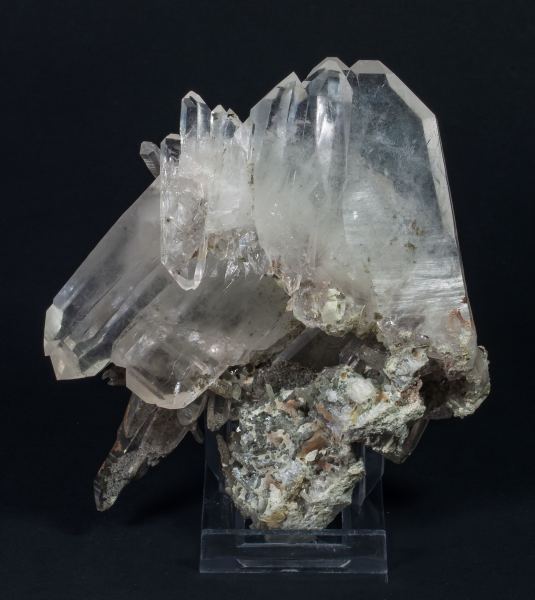 Group of very sharp Quartz crystals on matrix with a flattened shape and most of them being doubly terminated. With parallel growths, very lustrous and transparent and with a very visible faden thread and Chlorite inclusions.Ksar Tassemente, Alnif Commune, Tinghir Province, Drâa-Tafilalet Region Morocco (01/2020)