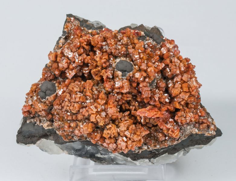 Parallel growths and polycrystalline forms of Vanadinite whose habit varies from tabular to short prismatic, very sharp, translucent, with an intense and uniform color and on a Quartz matrix with manganese oxides. Unusual quality for the locality.