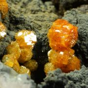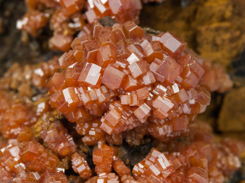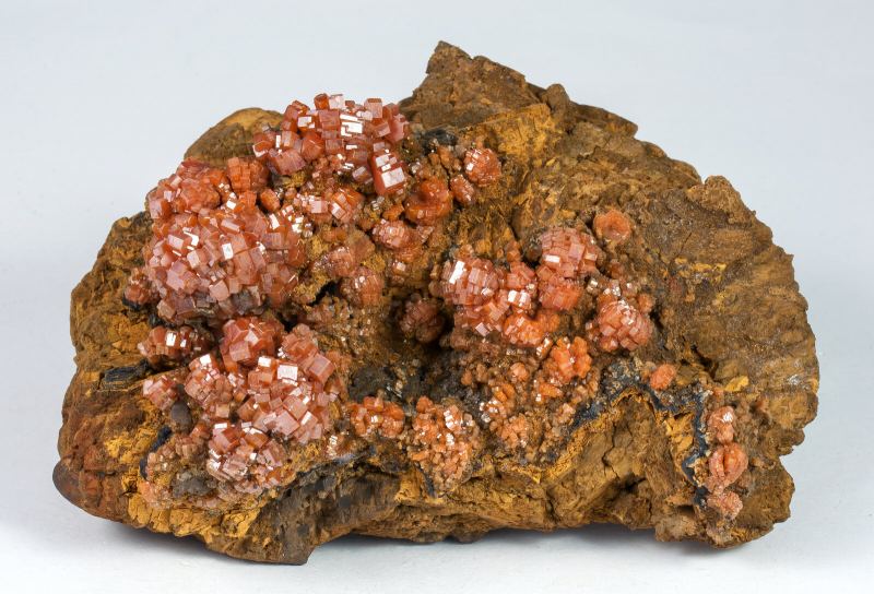 Spheroidal aggregates of Vanadinite crystals with a short prismatic habit. Translucent, with an intense and uniform color and on an unusual matrix of weathered rhombohedral Siderite crystals. Unusual quality for the locality.