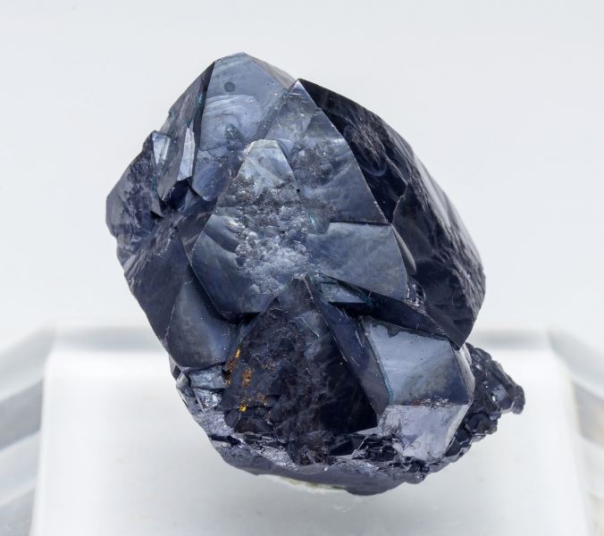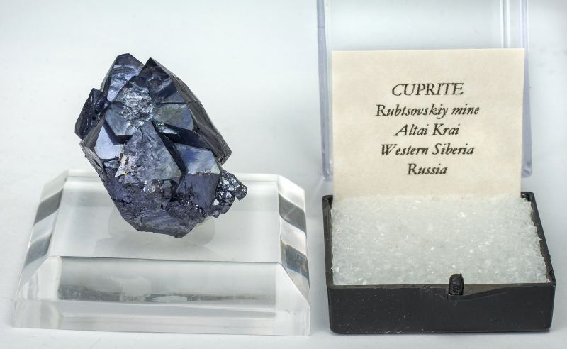 Polycrystalline growth of Cuprite with very sharp octahedral faces, with slight curvatures on the edges, with good luster and intense reddish internal reflections.We will ship the specimen in its original Perky box from the Robert J. Noble collection, which also contains the label.