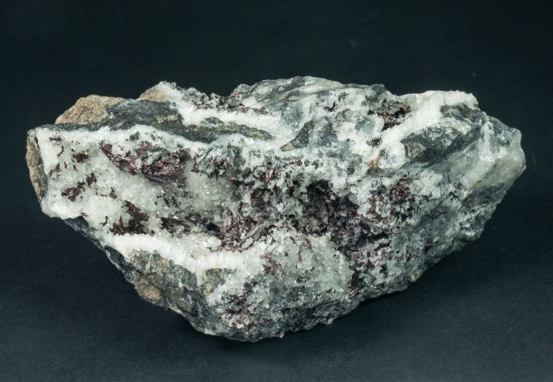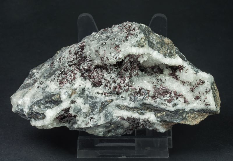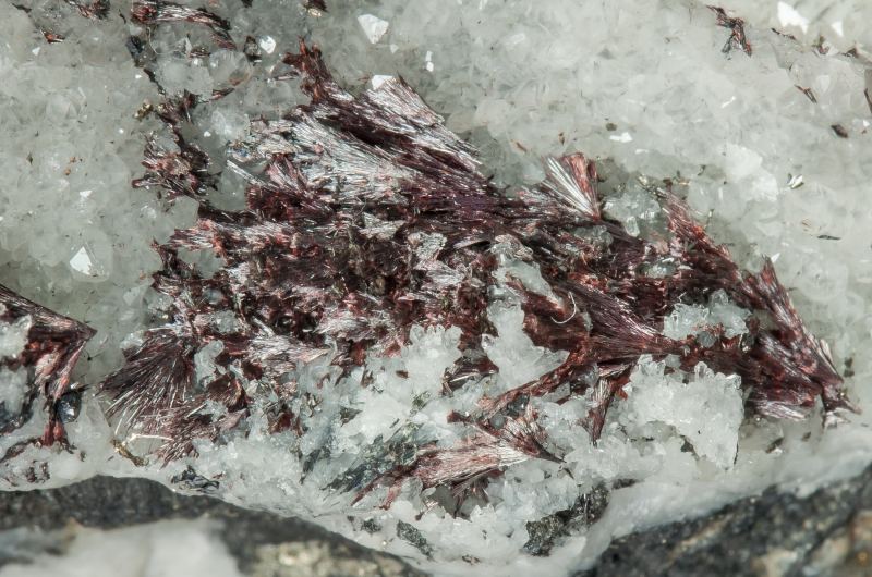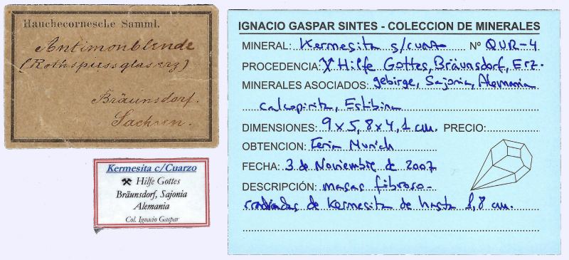 A classic of German mineralogy formed by fans of radiating Kermesite crystals of an intense crimson-red color, with a strong color contrast thanks to being deposited on snow-white Quartz crystals, on a rock matrix. From the type locality (TL) for the species, which is also the type locality for Diaphorite and Miargyrite.The specimen, which is accompanied by an old handwritten label, comes from the collection of Ignacio Gaspar Sintes, whose label and handwritten file we will send to the buyer of the piece.