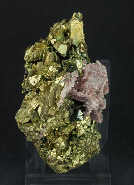 Group of complex Chalcopyrite crystals, with very sharp crystal forms, with a bright luster and microcrystalline Quartz coating that has left geometric cavities that correspond to missing crystals.Of high quality, the specimen comes from an important European collection.