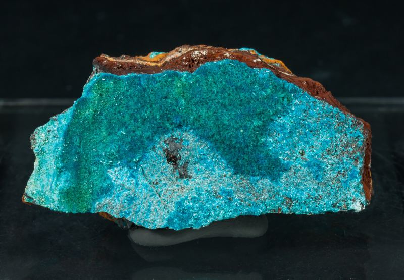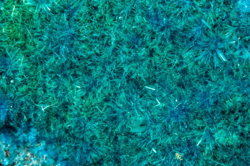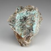 Double crust formed by a covering of bluish Aurichalcite crystals completely covering a limonitic rock on which was partially deposited a large group of very fine acicular Serpierite crystals with bluish green hues.The specimen is from the type locality for Serpierite.