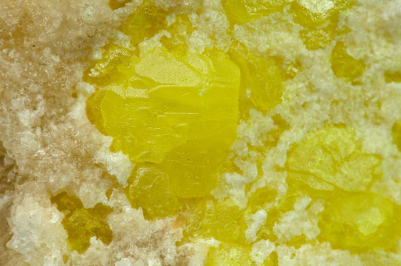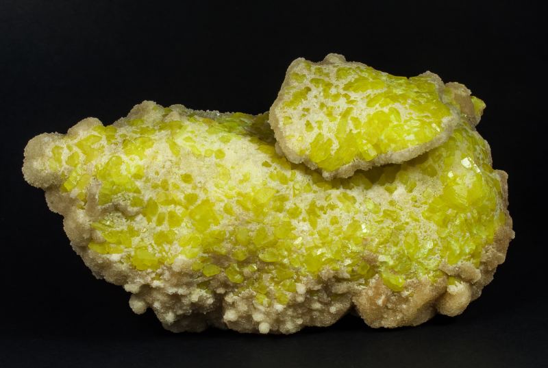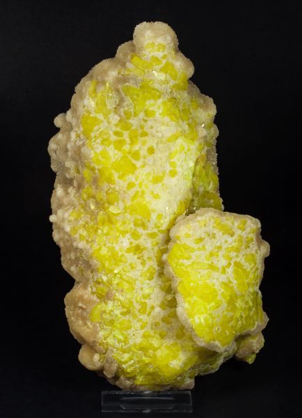 Scalenohedral crystal of Calcite covered by a second generation of botryoidal Calcite crystals and Sulphur crystals with sharp crystal forms. Different.Agrigento (Girgenti) Province, Sicily Italy