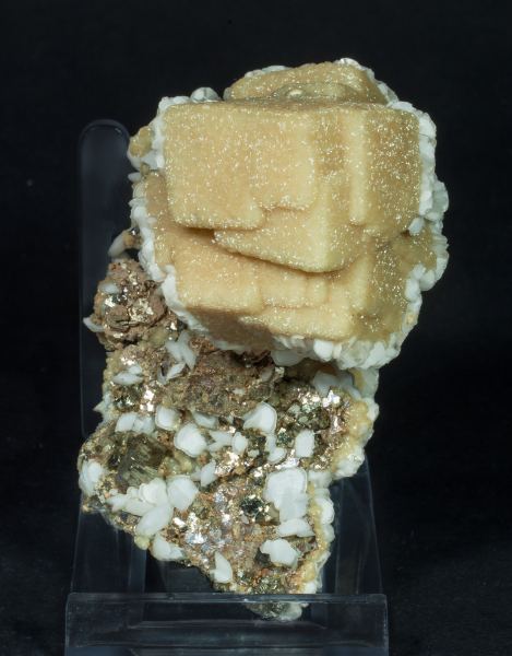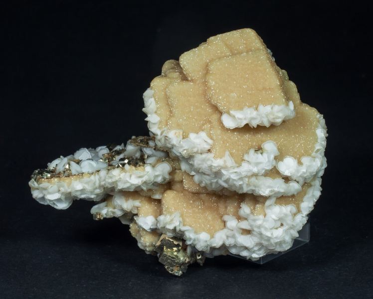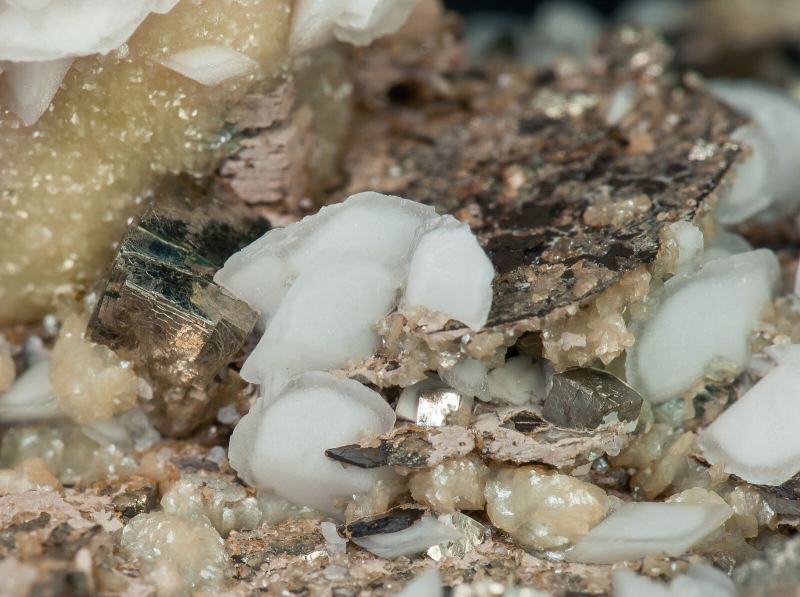 Very aerial and aesthetic growth of Calcite in which two growth phases coexist, a first, with rhombohedral crystals with very well defined shapes and a pale cream color, and a second that forms partial coatings with white, translucent, lenticular crystals with geometric zoning. On matrix, with small, very shiny Pyrite crystals.Stan Trg (Stari Trg) Mine, Trepča Complex, Trepča Valley, Kosovska Mitrovica, Kosovska Mitrovica District Kosovo (2000-2021)