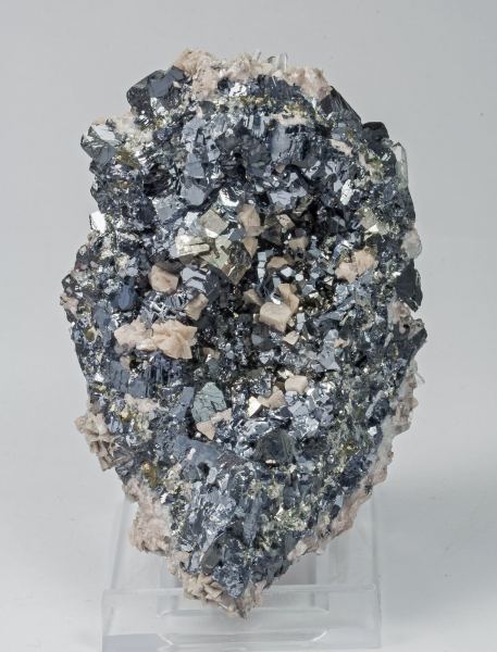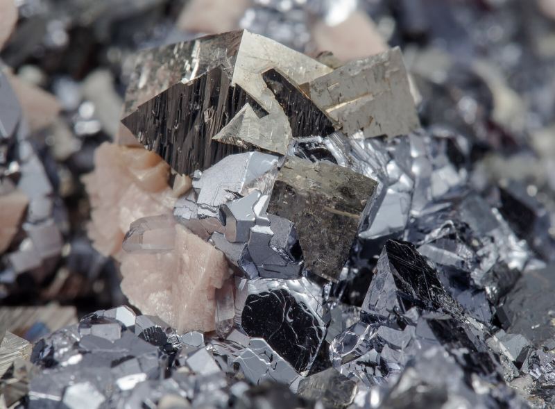 Shiny cubo-octahedral Galena crystals, with very sharp crystal forms, on matrix, with very sharp and lustrous Arsenopyrite crystals and small rhombohedral Rhodochrosite crystals.Stan Trg (Stari Trg) Mine, Trepča Complex, Trepča Valley, Kosovska Mitrovica, Kosovska Mitrovica District Kosovo (2000-2021)