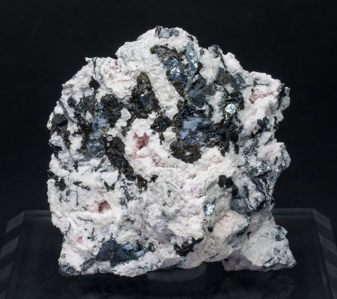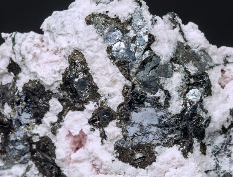 Groups of lamellar and lustrous Nagyágite crystals on a matrix with pale pink Rhodochrosite coatings. The specimen, a European classic from the type locality for the species, comes from the collection of Ignacio Gaspar Sintes (number NAG-2), whose label we will send to the buyer.Sacarîmb (Nagyág), Deva, Hunedoara Romania