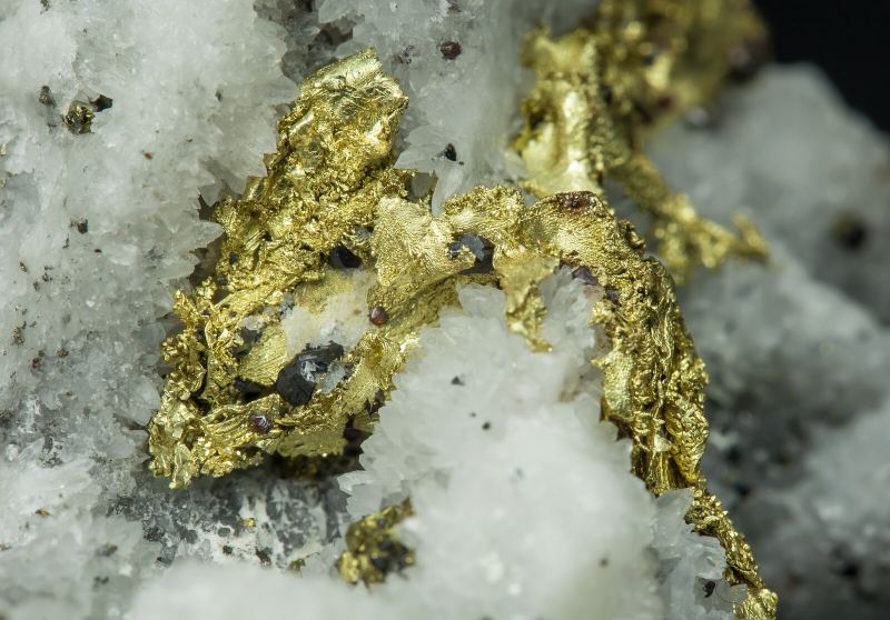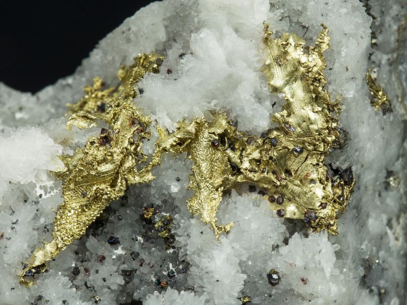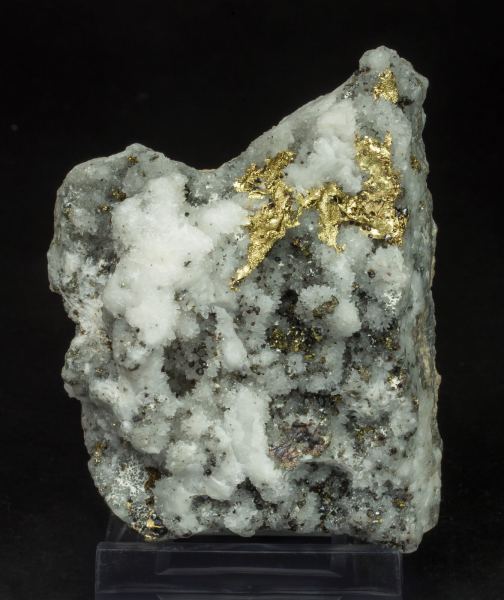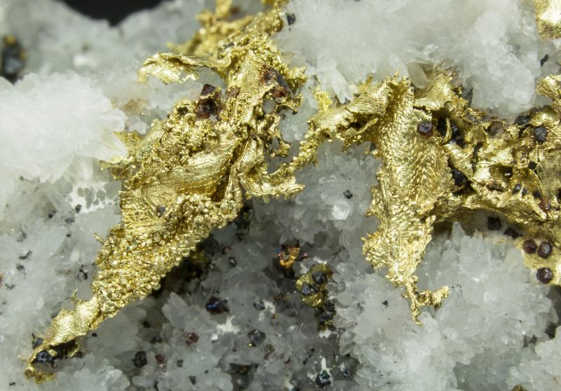 Lamellar and hooked growths of Gold (silver-bearing variety), very lustrous, on a Quartz matrix with small Chalcopyrite crystals and darker, rounded Sphalerite crystals. The specimen has been analyzed giving 20% silver. We will send a copy of the analysis to the buyer.