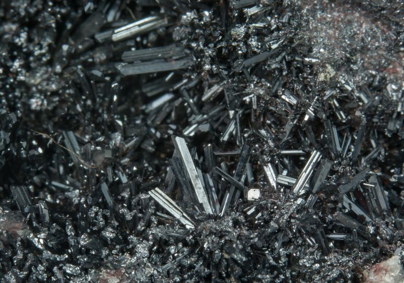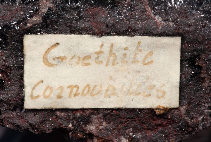 Group of fine elongated Goethite crystals, very sharp and lustrous, in a matrix of ferruginous rock partially covered by crystalline aggregates of Hematite in the form of crusts, and disseminated Quartz crystals giving a color contrast with the oxides.The specimen, an English classic from an iron mine in Cornwall which closed in 1883, comes from the old collection of Robert-Auguste Touchon.