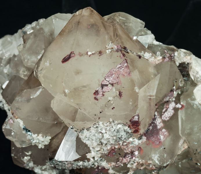 Group of Quartz crystals with the characteristic morphology of this classic deposit, doubly terminated and with little development of the prism faces. They are translucent, lustrous, and have coatings of lamellar Hematite crystals and inclusions of the same mineral with an intense red color. They are associated with small white Calcite crystals.An English classic from the collection of General Robert Touchon.