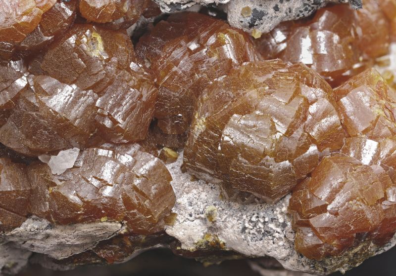 Mimetite crystals of very good size, with a rounded, almost spherical habit (variety campylite) but with easily recognizable crystal forms. They have good luster, orange color, and are on matrix, with white lamellar Baryte crystals. The specimen comes from the old collection of Robert-Auguste Touchon and attached on the back has an old handwritten label with details of the specimen.