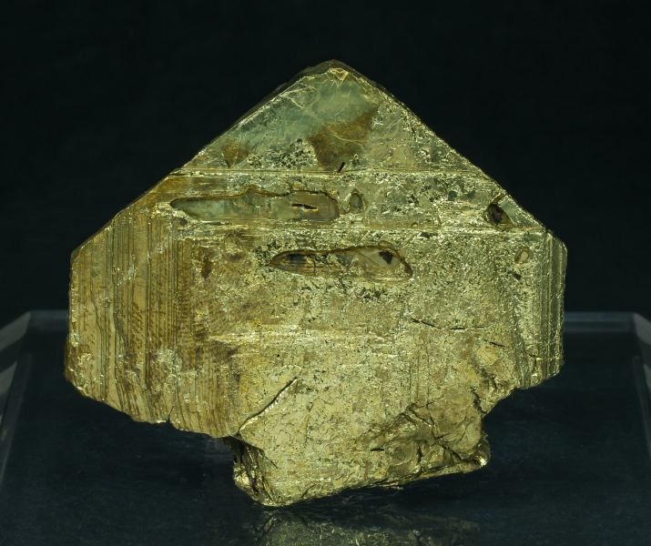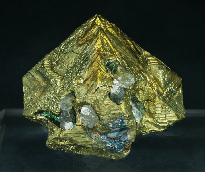 Obtained at Ste. Marie 2022Disphenoidal Chalcopyrite crystal with very well defined faces and edges, fine polycrystalline growths, good luster and intense yellow color, more vivid than what is usually seen from La Gardette, and of considerable size. Accompanied on its rear by transparent and bright Quartz crystals with the typical habit of the locality.
