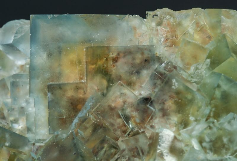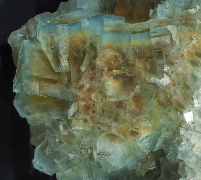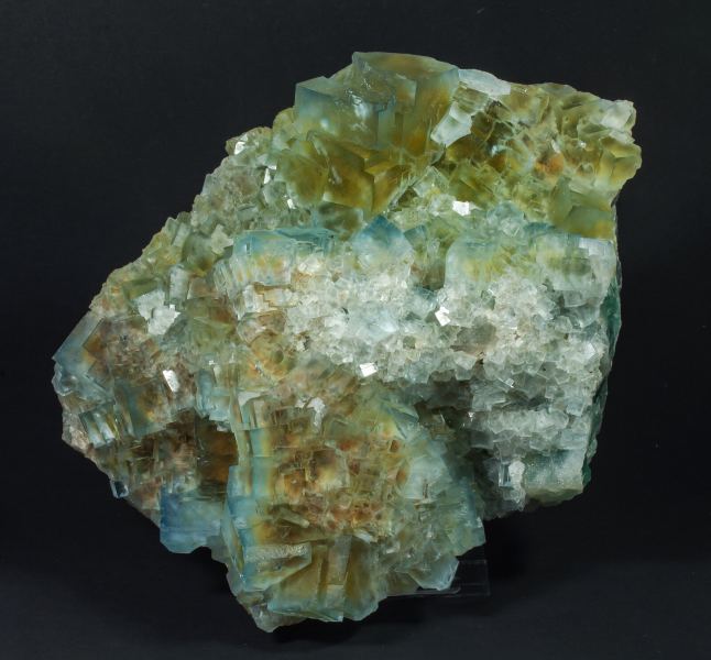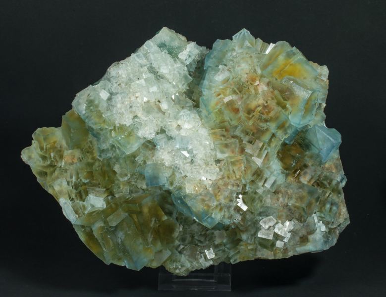 Druse of very sharp Fluorite crystals, between transparent and translucent, with good luster and a yellow core and bluish green outer areas. High quality and size for what is known from this mine, it comes from a limited find made in 2019La Barre Mine, Saint-Jacques-d'Ambur, Pontgibaud, Saint-Ours, Riom, Puy-de-Dôme Department, Auvergne-Rhône-Alpes France (2019)