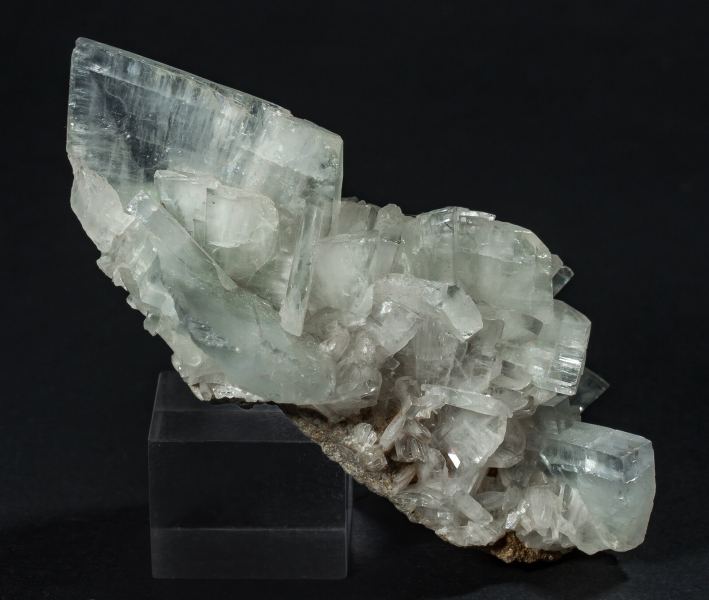 Aggregate of Baryte crystals with a tabular habit, one of them clearly dominant and doubly terminated, with a slight bluish color and more transparent areas towards the termination of the crystal. The specimen has a somewhat higher quality than what is usually found in that mine, where Baryte is not the most prominent species. This specimen comes from the collection of Alain Martaud whose label we will send to the buyer.