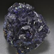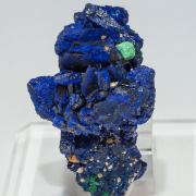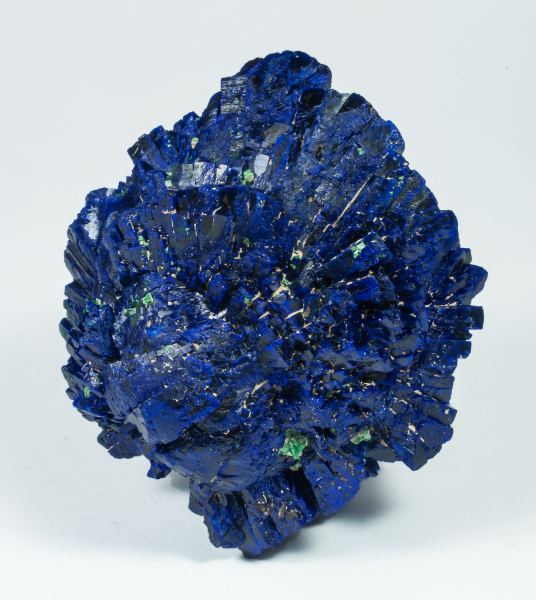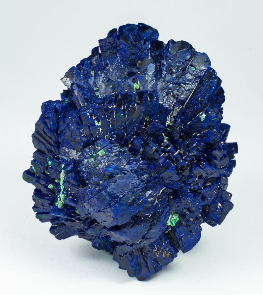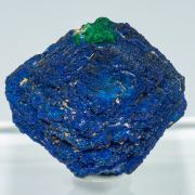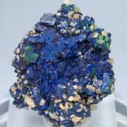 Obtained at Munich 2022Floater spheroidal aggregate of flattened Azurite crystals with very sharp crystal forms, with a vivid blue color and with small coatings of Malachite crystals pseudomorphing cuprite. A French classic of high quality that comes from the type locality for the species.